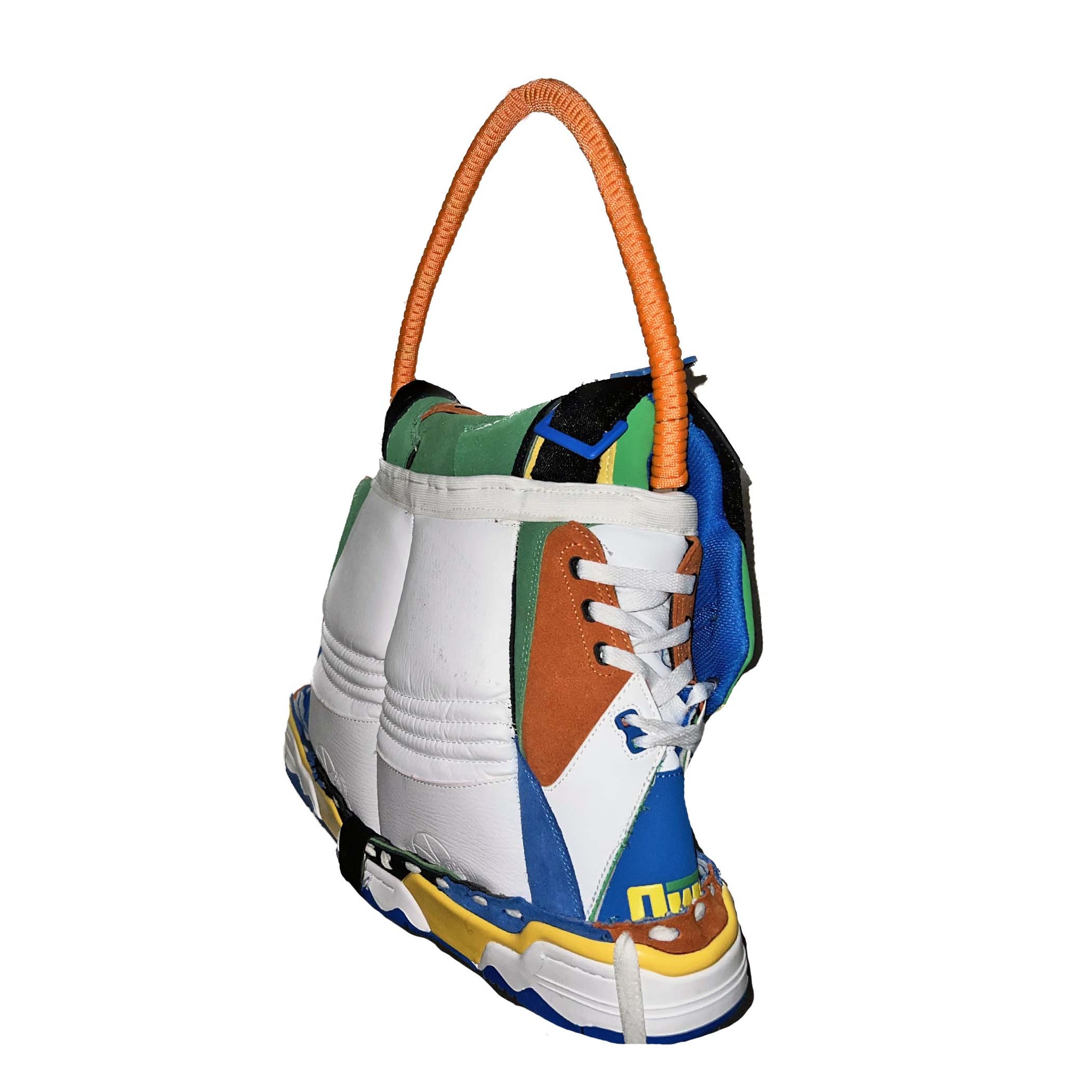 FMG X EPMO SNEAKER BAG, handmade using sustainably sourced materials. Bag is 13X9 with a 20 inch handle.