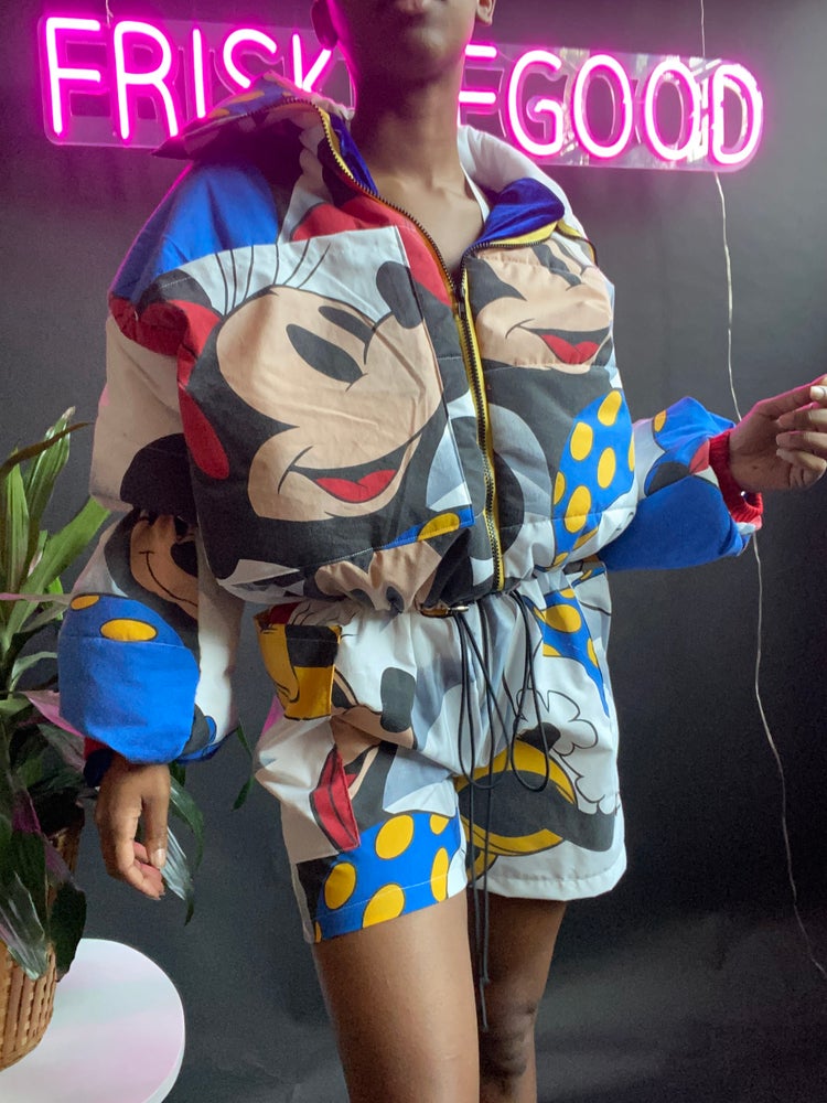 Hey Mickey Puffer Set! Comes with jacket lined with premium velvet fabric ( can fit sizes small-med) , bra top (fits a-b) , + shorts (adjustable waist band can fit small-large) . Handmade and upcycled using retrosheet. Jacket ($225) + set ($55) can be sold separately