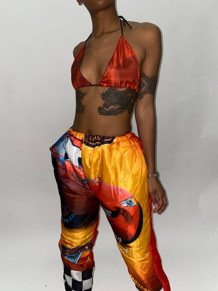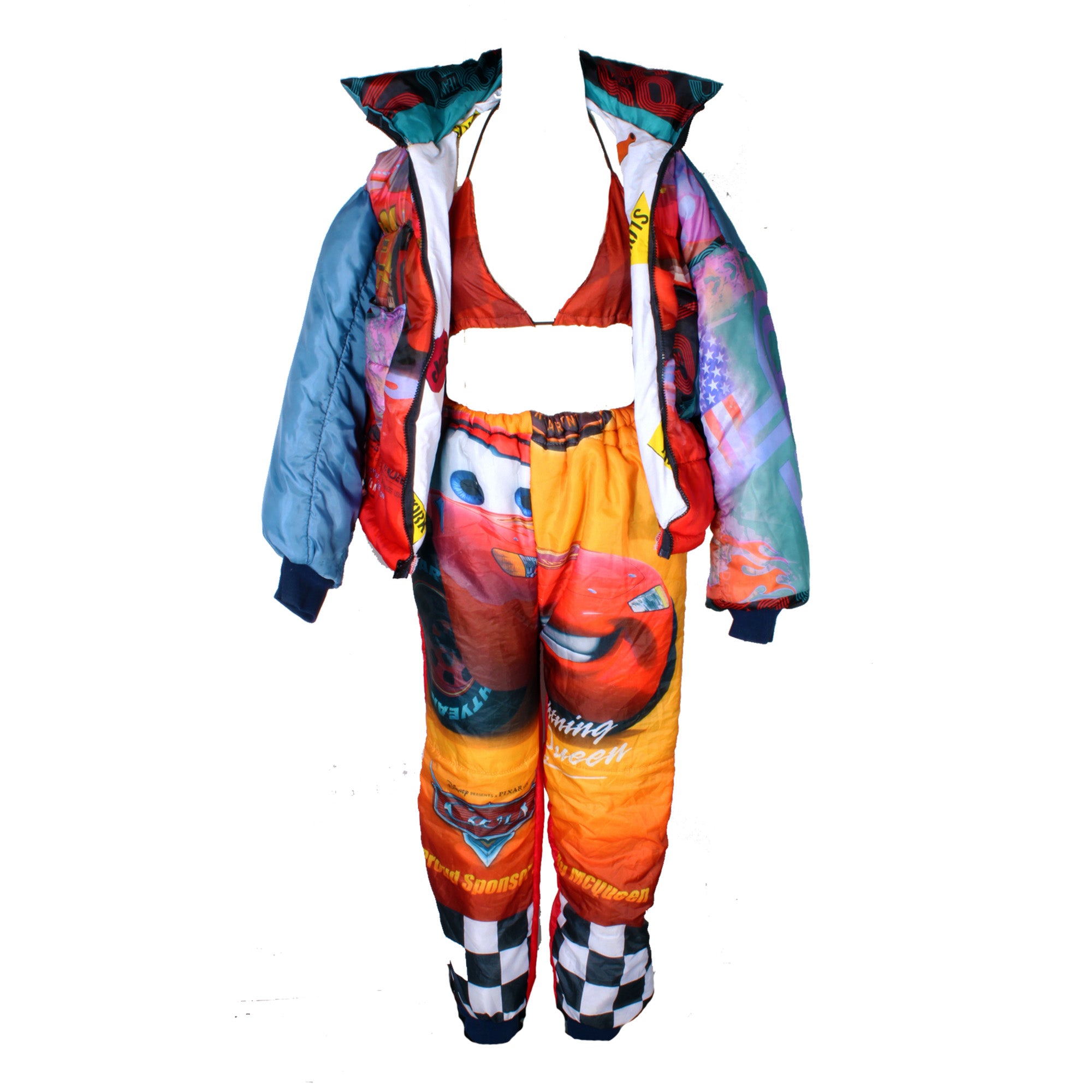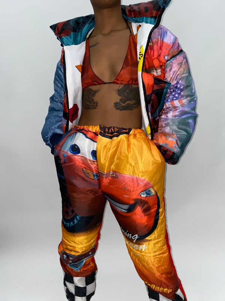 FRISKMEGOOD Lightening Mcqeen Puffer Set ! Comes with jacket (s/m), bra top (A-C) , + snow pants (s/m) , handmade and upcycled using Cars sleeping bags 😍🔥 can fit small or medium