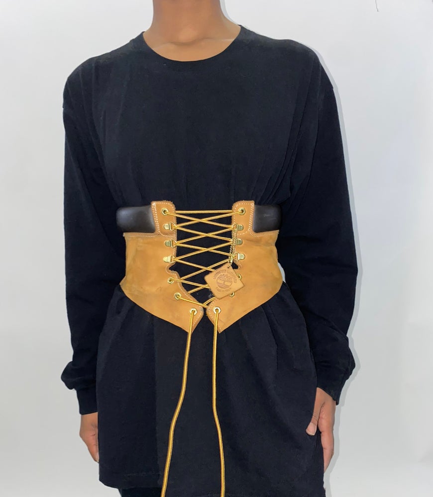 FRISKMEGOOD T!mberl@nd Corset, handmade and upcycled using my dads old work boots ! Can fit waist sizes 26-42 , 100% adjustable ✨