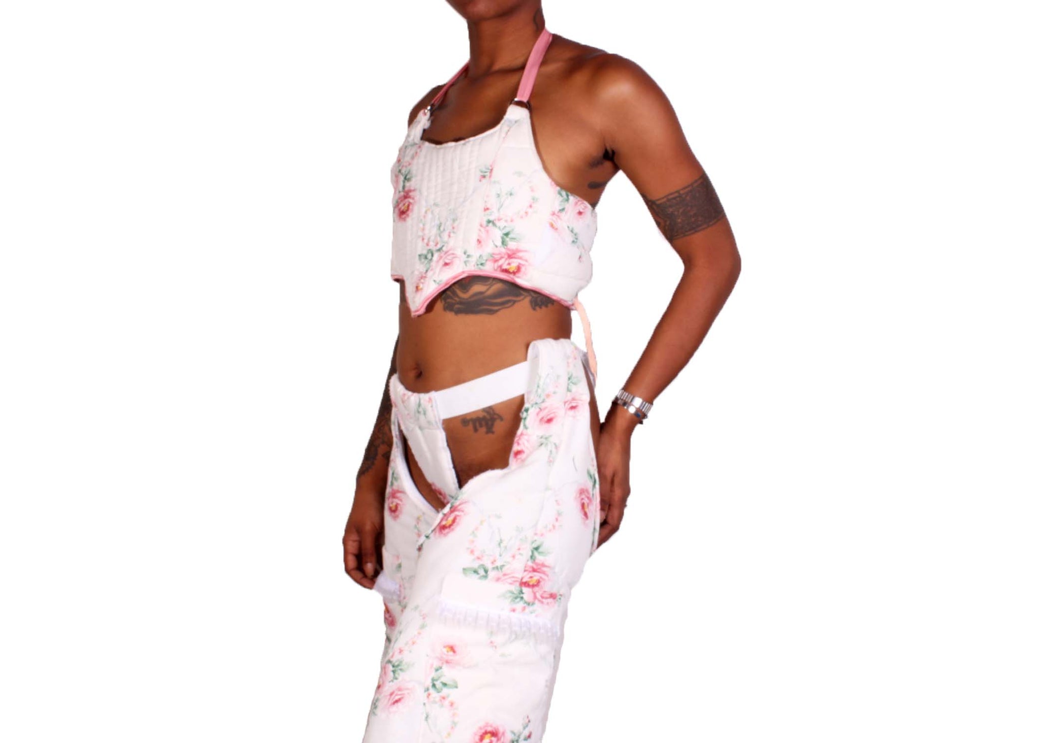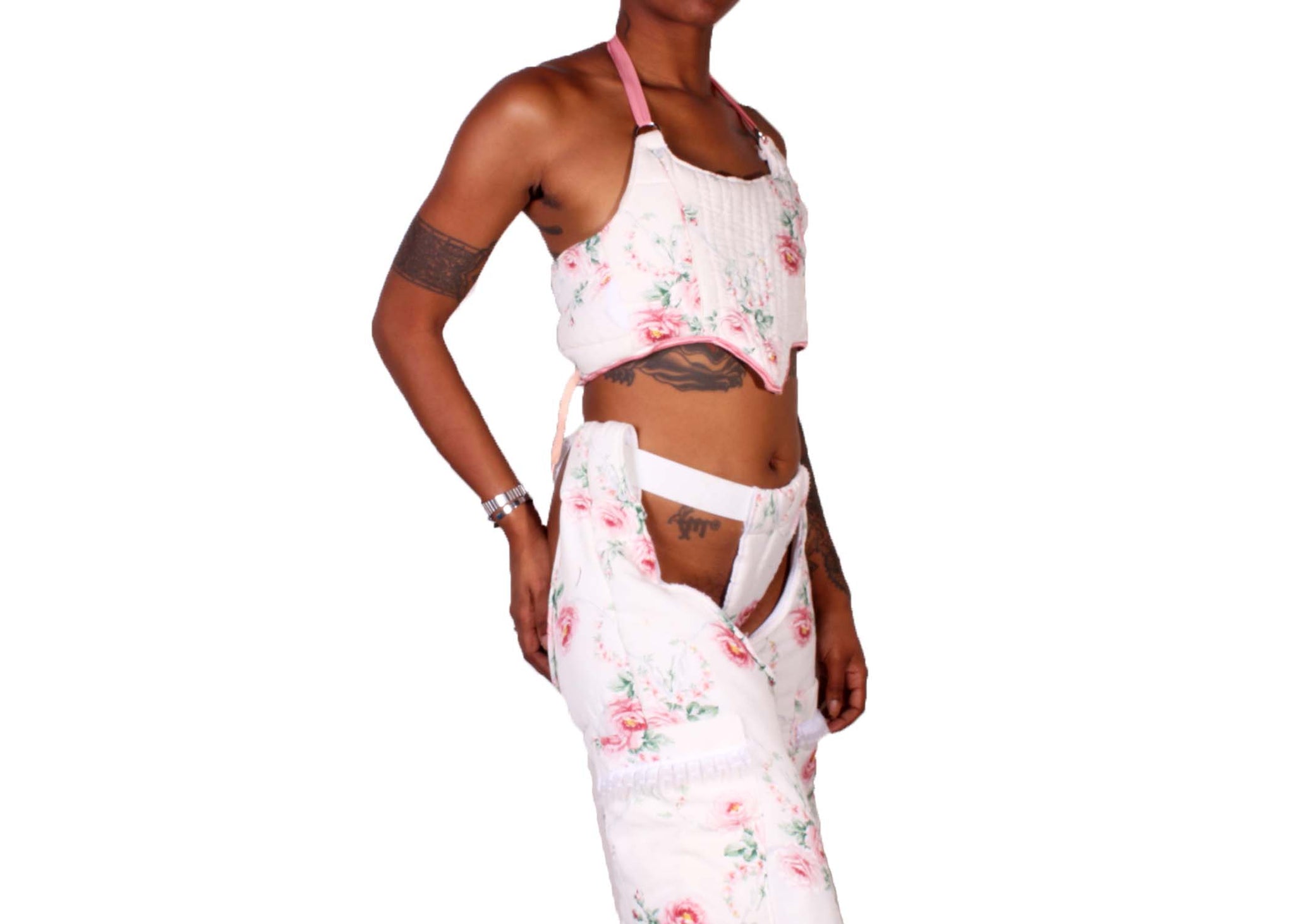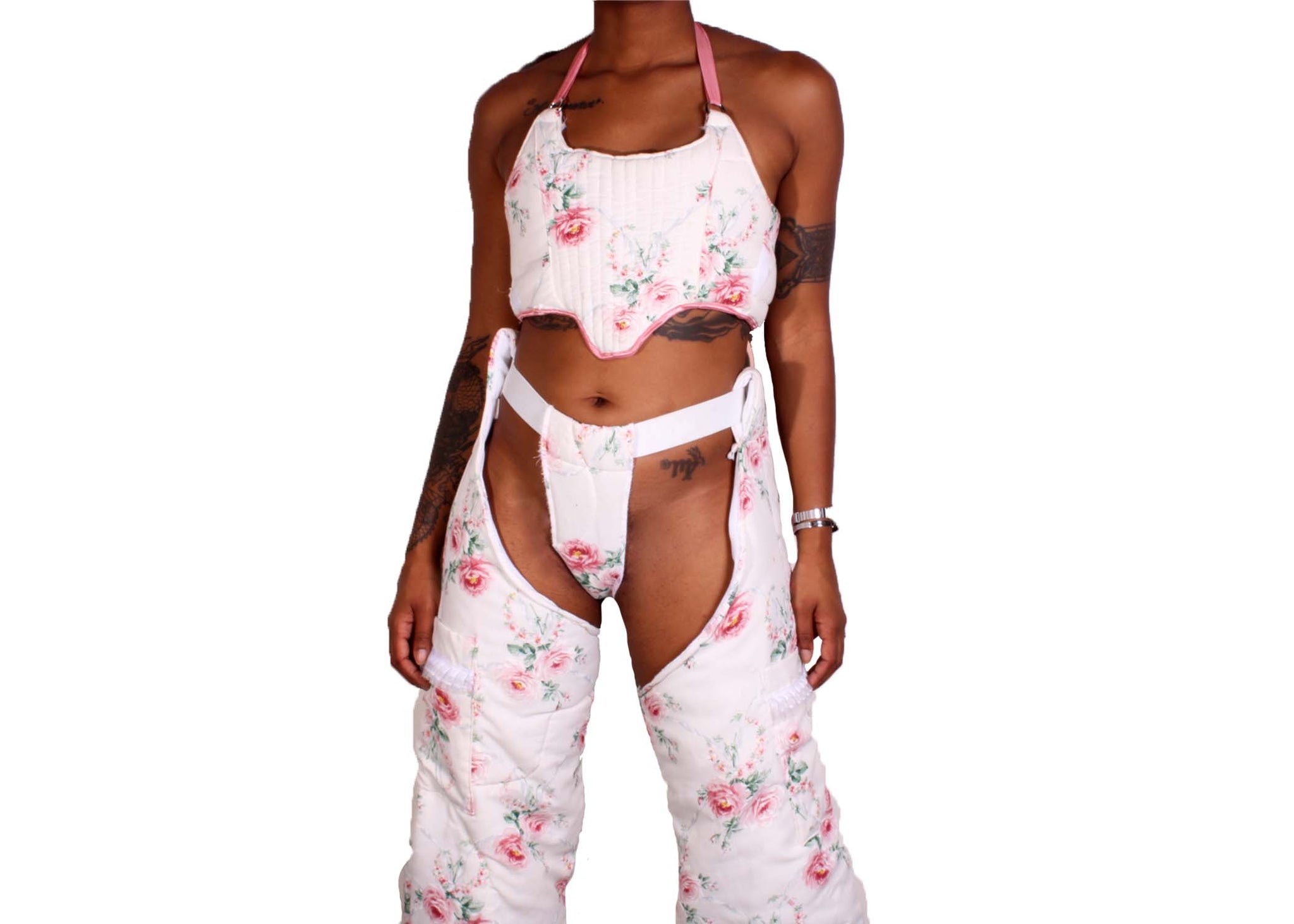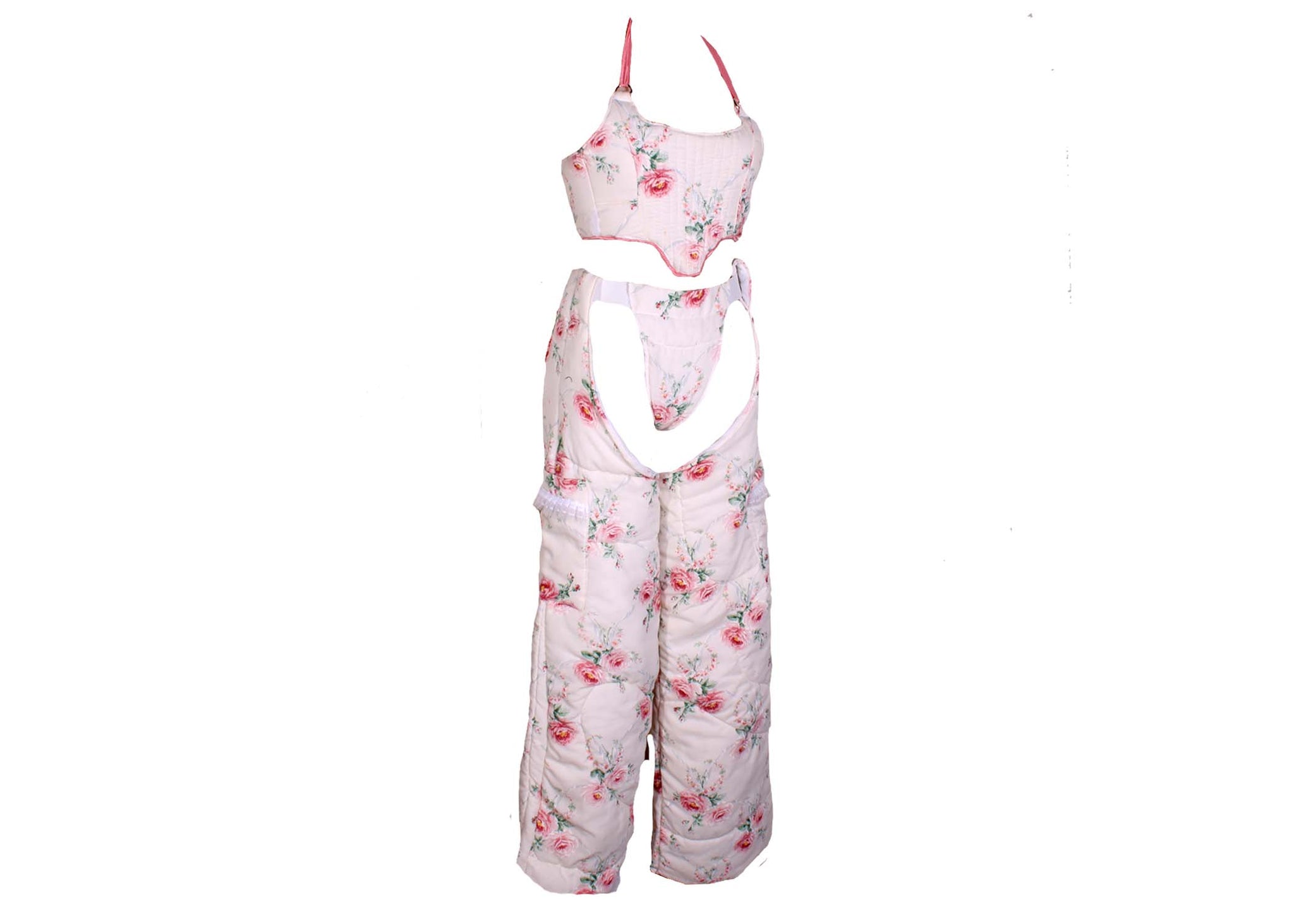 Unique Antique Chap Set, handmade and upcycled using a vintage blanket. Top can fit sizes small/medium, chaps can also fit a small/medium. Thigh circumference 24” + length from waist 44”, waist band stretches can fit 22+