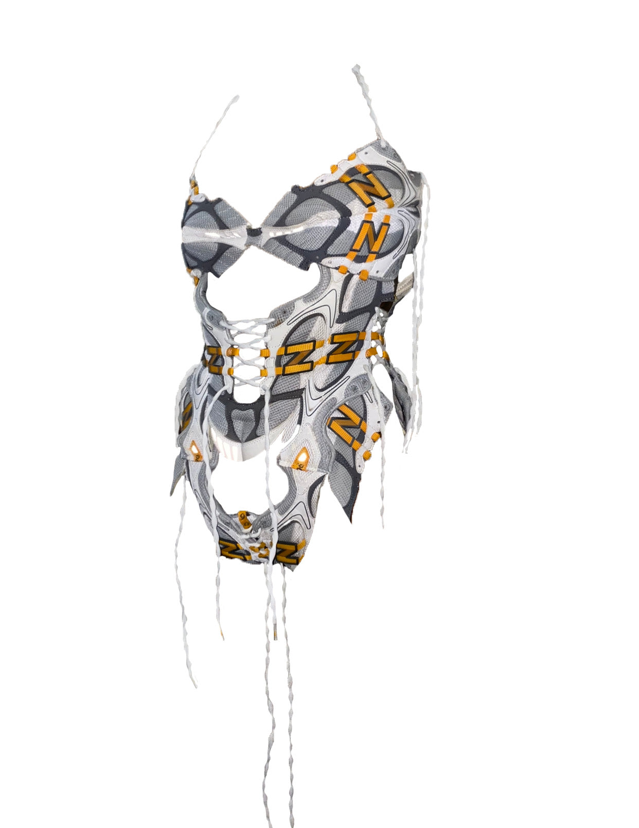 Upcycled FMG 900 bodysuit, handmade using recycled materials! Can fit sizes small to medium!